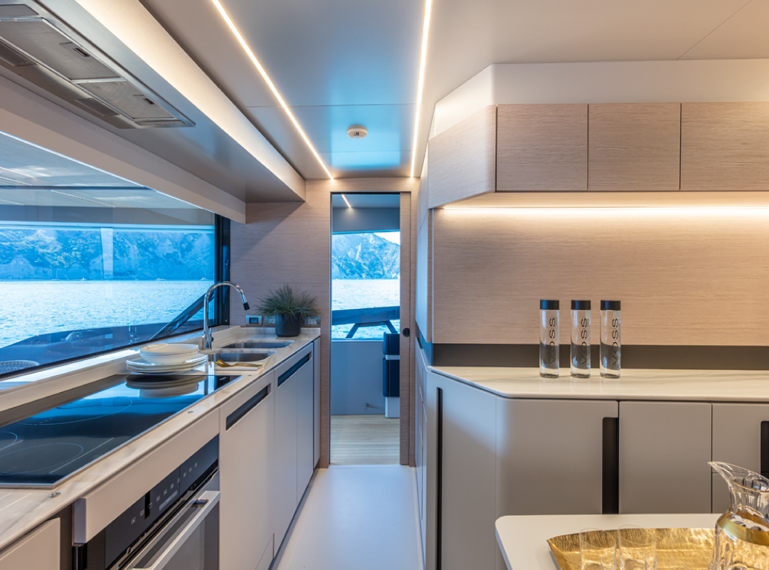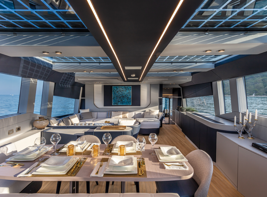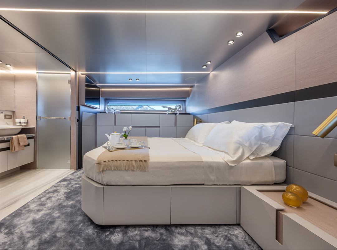 Once the yacht was commissioned, Lawson Robb began work on the interiors creating a contemporary but pared-back interior with a penthouse feel as requested in the brief, revolving around a colour scheme of blues and greys. Changes to meet the brief internally also began by making changes to the cabinetry and the creation of a feature area in the main saloon where the owner could display a favourite piece of art, all of which creates the requested serene and calm environment.