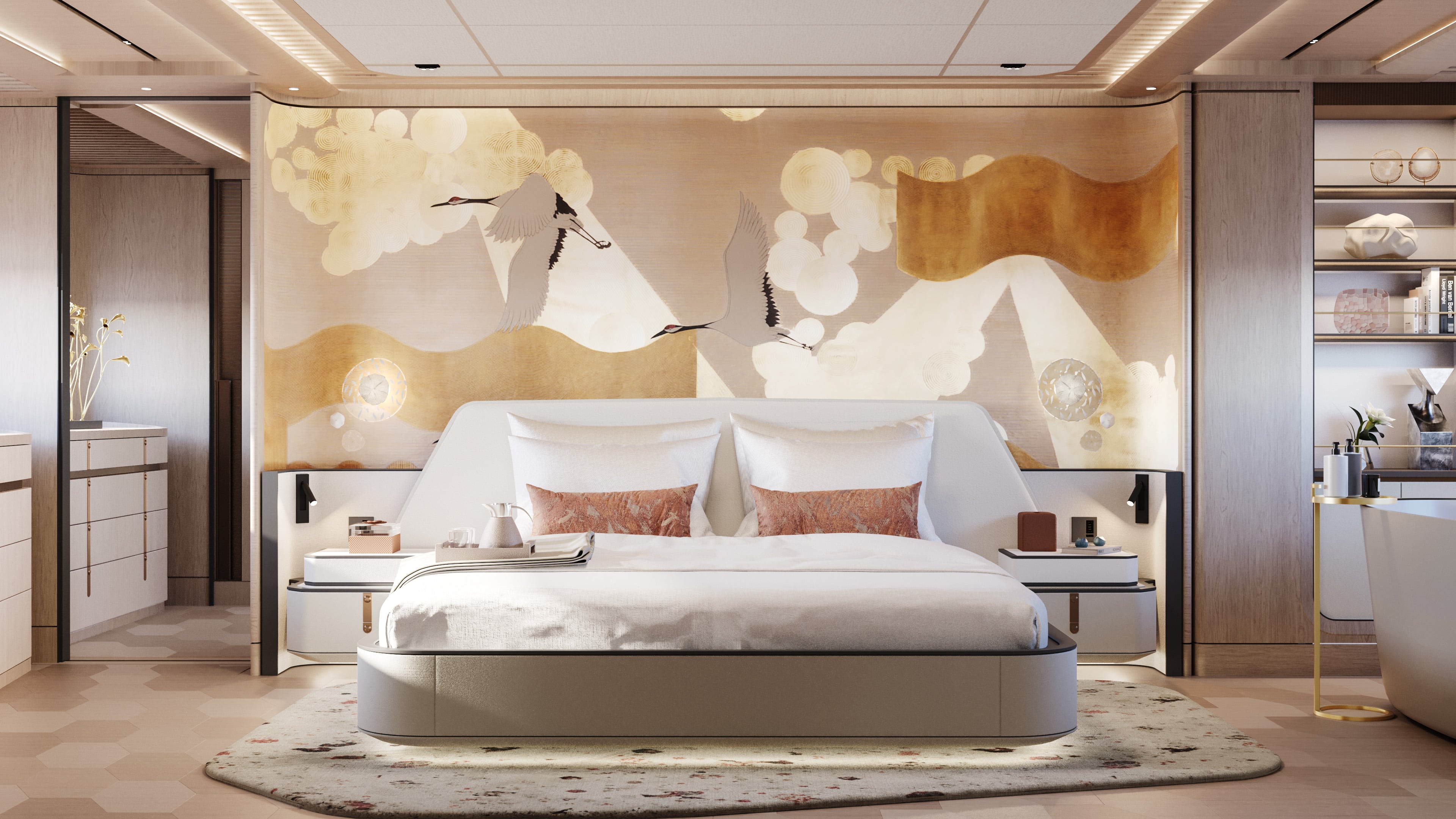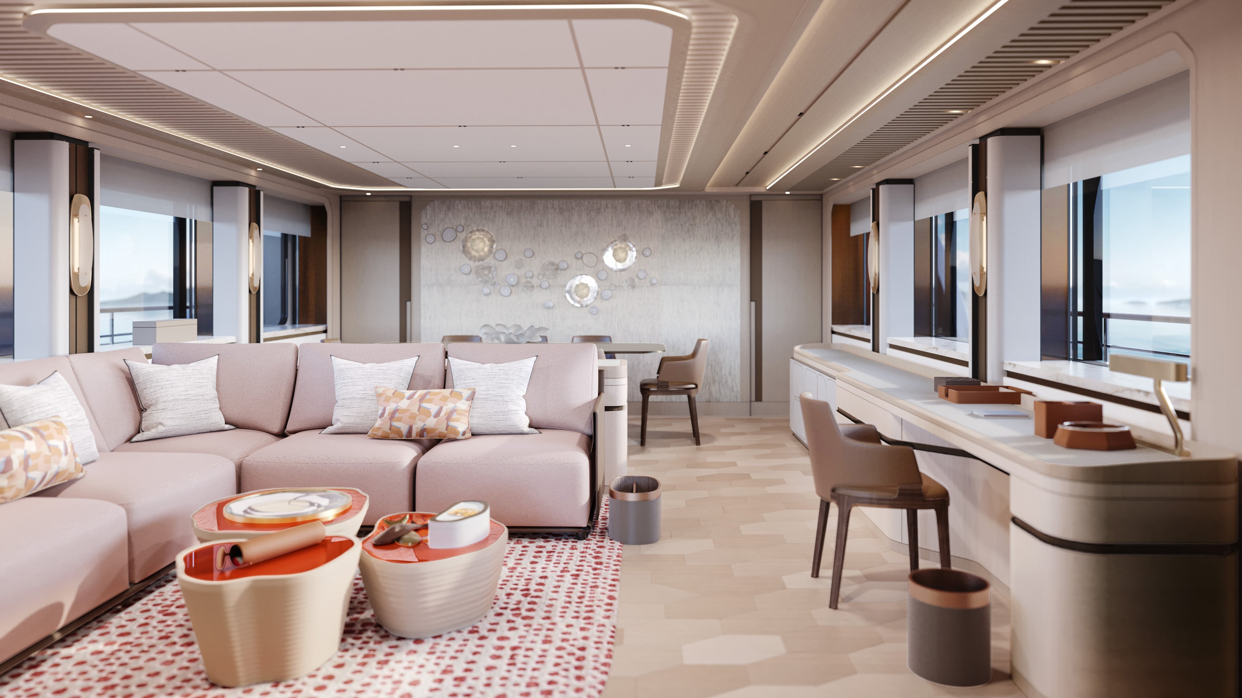 The yacht showcases natural materials and a minimalistic interior. Large wrap-around windows define the motor yacht, ensuring she is bathed in sunlight throughout the day. New renders display her spacious main saloon, featuring an L-shaped sofa surrounding three uniquely shaped coffee tables, with an adjacent dedicated dining area and study space. Modern wall art, unique sculptures and contemporary furniture is pictured throughout Haze II’s interior, while her skylounge is characterised by a distinctive statement wall.