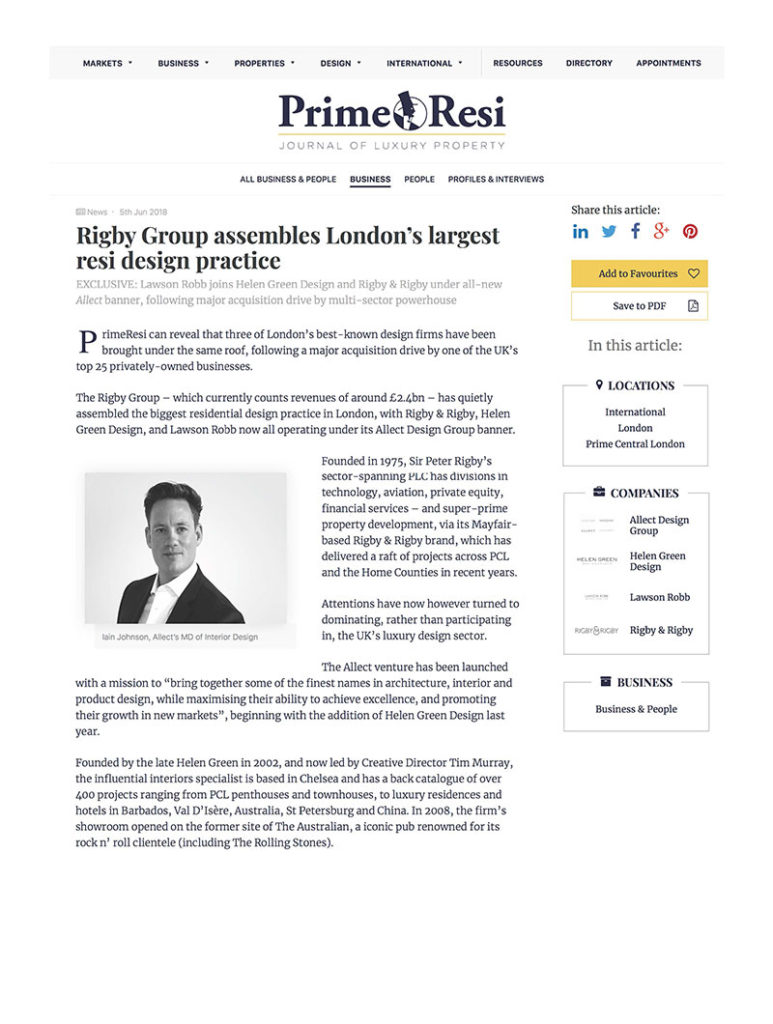 Featured in Prime Resi, Lawson Robb has now joined one of the UK’s most established family businesses The Rigby Group Plc, by being one of the founding design companies within the Allect Design Group.The Rigby Group – which currently counts revenues of around £2.4bn – has assembled the biggest residential design practice in London, with Rigby & Rigby, Helen Green Design, and Lawson Robb now all operating under its Allect Design Group banner.Founded in 1975, Sir Peter Rigby’s sector-spanning PLC has divisions in technology, aviation, private equity, financial services – and super-prime property development, via its Mayfair-based Rigby & Rigby brand.Attentions have now however turned to dominating, rather than participating in, the UK’s luxury design sector. The Allect venture has been launched with a mission to “bring together some of the finest names in architecture, interior and product design, while maximising their ability to achieve excellence, and promoting their growth in new markets”, beginning with the addition of Helen Green Design last year, and Lawson Robb this year.From Prime Resi:Already considered a top ten operation in London, Lawson Robb studio has a loyal international following, particularly amongst Middle Eastern HNWI, and has picked up a slew of design awards for its ultra-luxe resi and marine endeavours in the UK and overseas.From Lawson Robb:“We are extremely excited to be starting this venture with both Rigby Group, and the Allect Design Group’s stable of prestigious design brands. We are delighted to work with Allect to expand our vision for Lawson Robb and to invest in our future, we see huge potential for Lawson Robb and its overseas expansion and with a substantial committed investment fund, we can look to invest in people, offices and systems to ensure we are at the leading edge of design.”Click here to read more.
