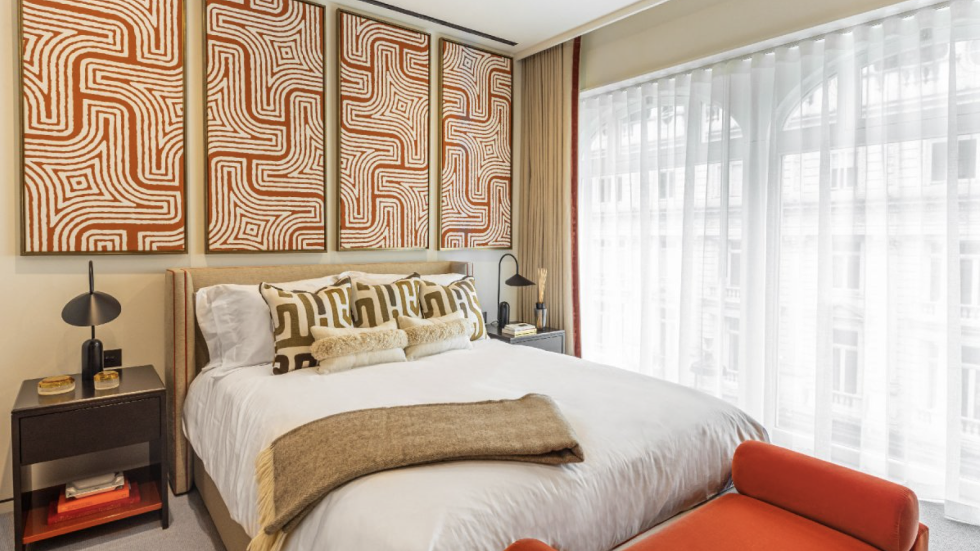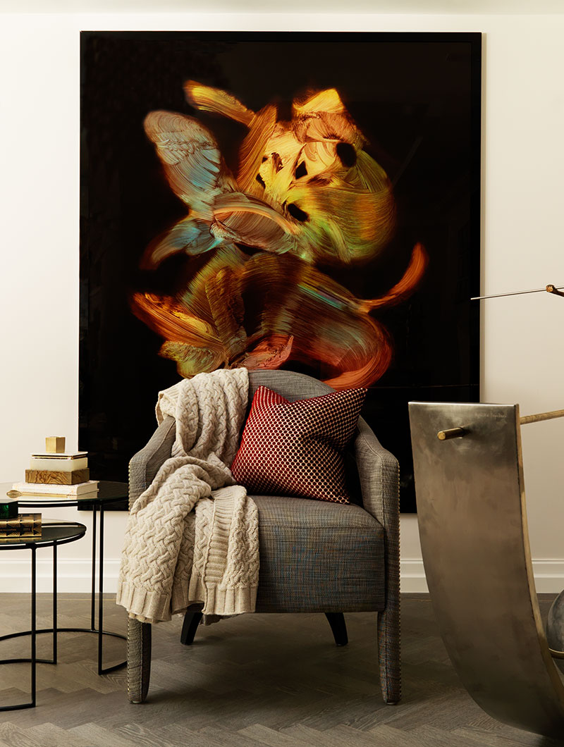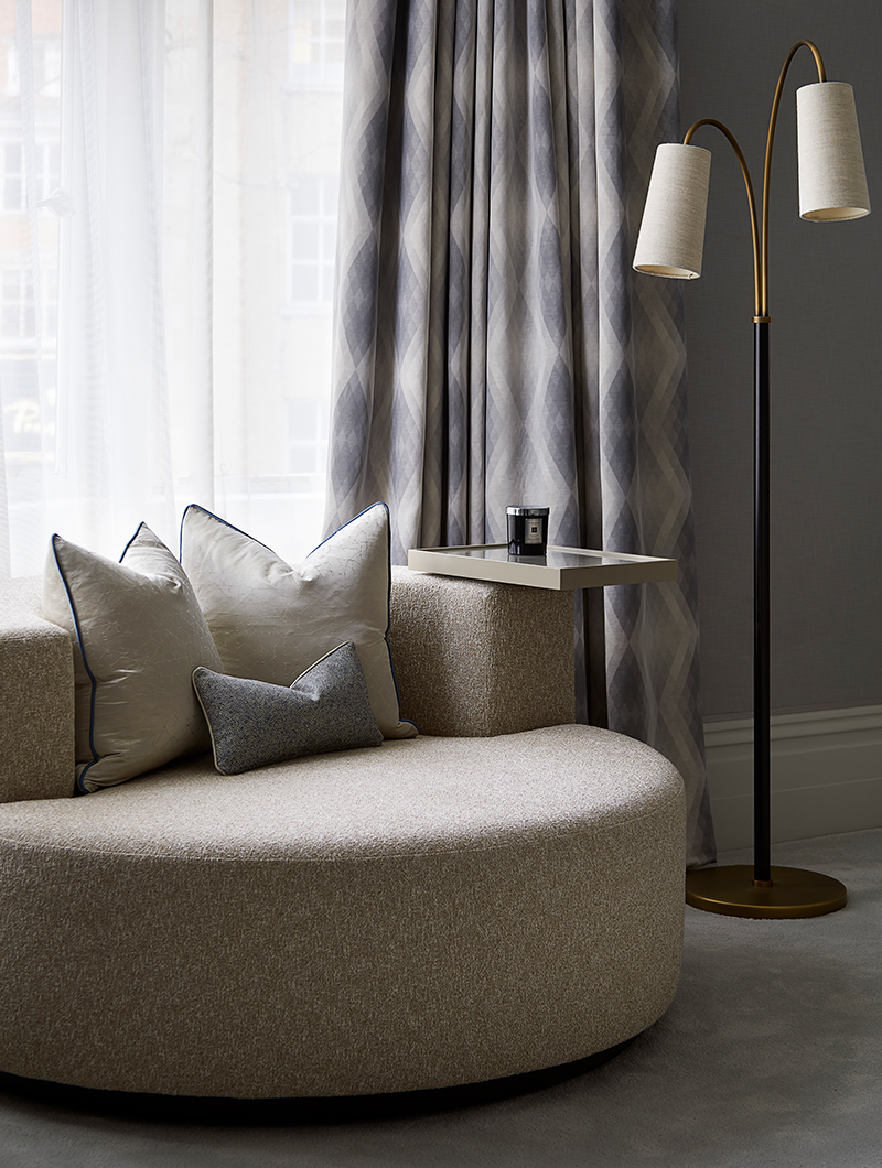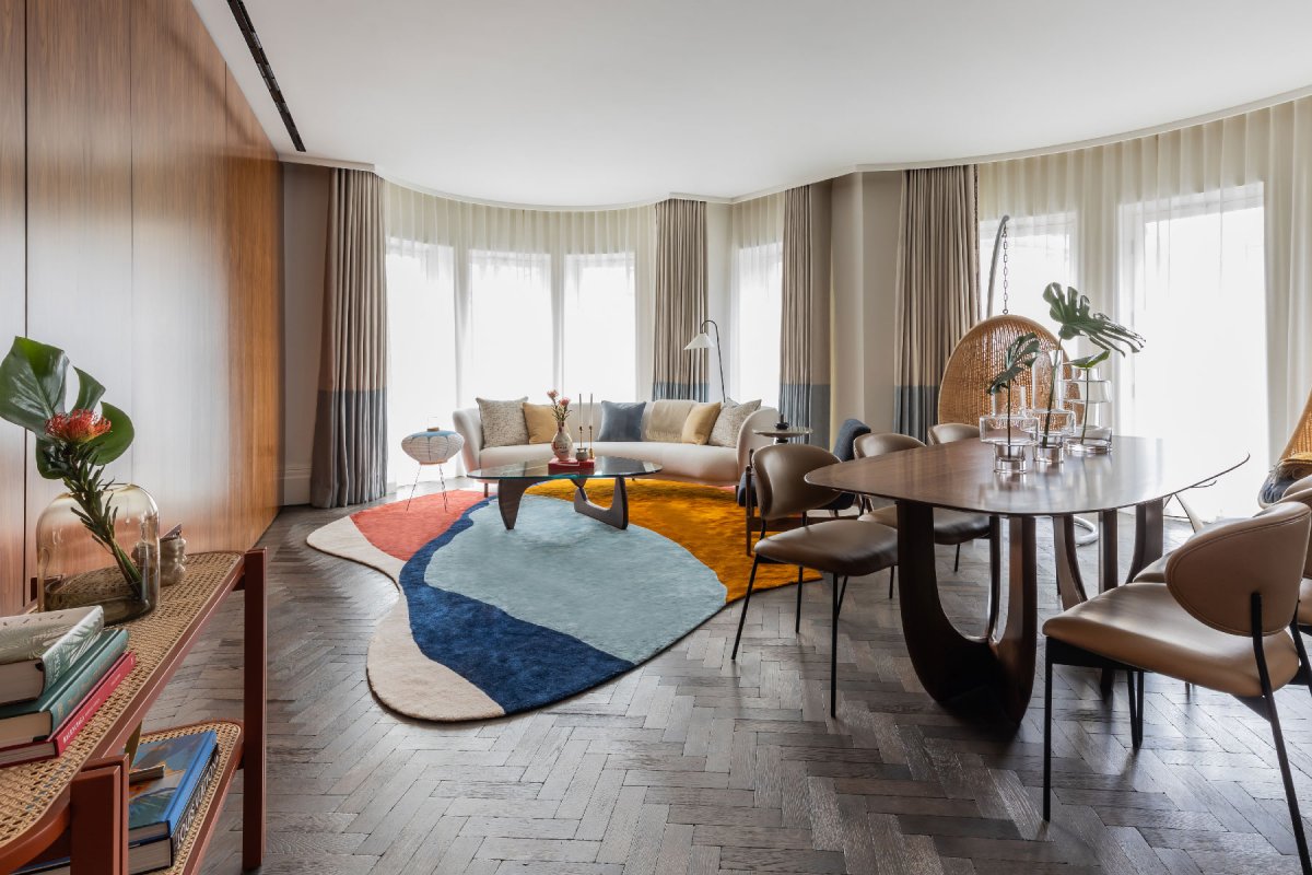 Lawson Robb designed the 3-bedroom apartment with a young, fashionable art enthusiast in mind, daring to play with colour whilst retaining the minimal backdrop. Organic shapes and playful details in the accessories and furniture add an element of tactility and fun with the bustling Bond Street in the background.